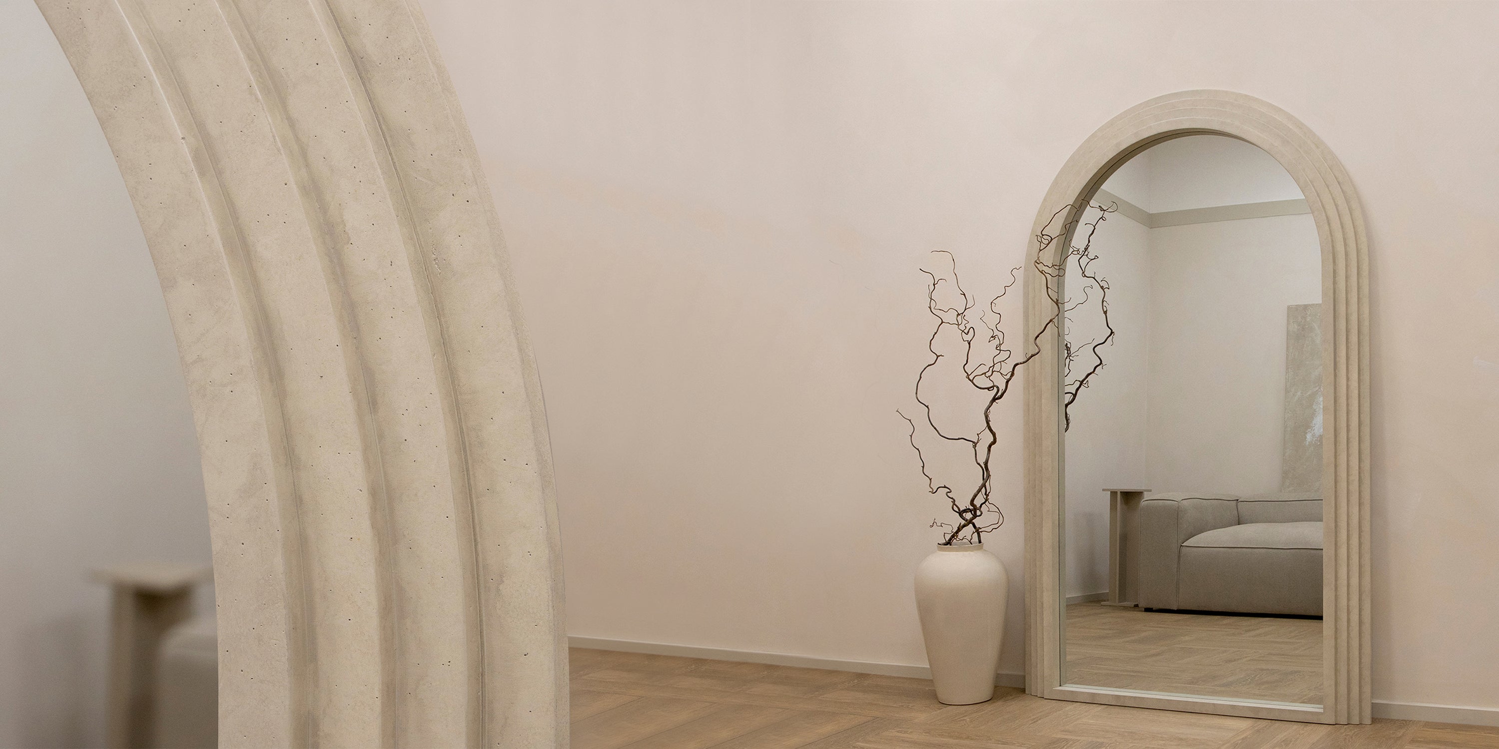 Maintaining its arched shape and exclusive stepped frame, we now introduce a slender design measuring 180cm x 80cm and the Luciana overmantle to complement new spaces. Both options are crafted with high-quality finishes in natural and classic tones - featured in washed wood and concrete.