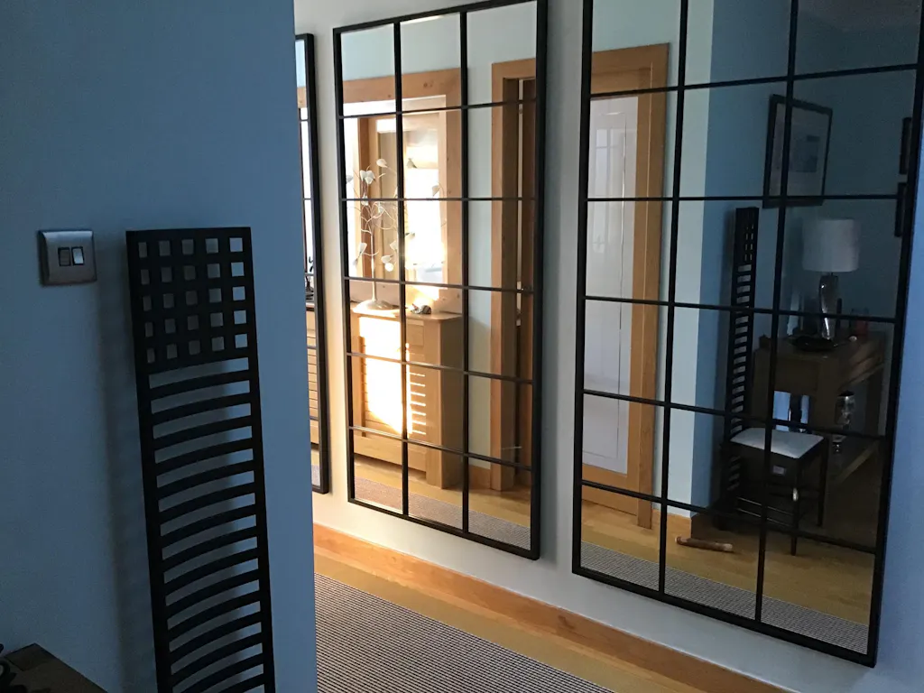 - Inner Size - Metal window frame layered onto single sheet of glass providing 18 individual mirror areas to create the faux window look